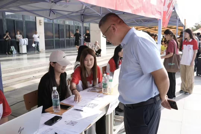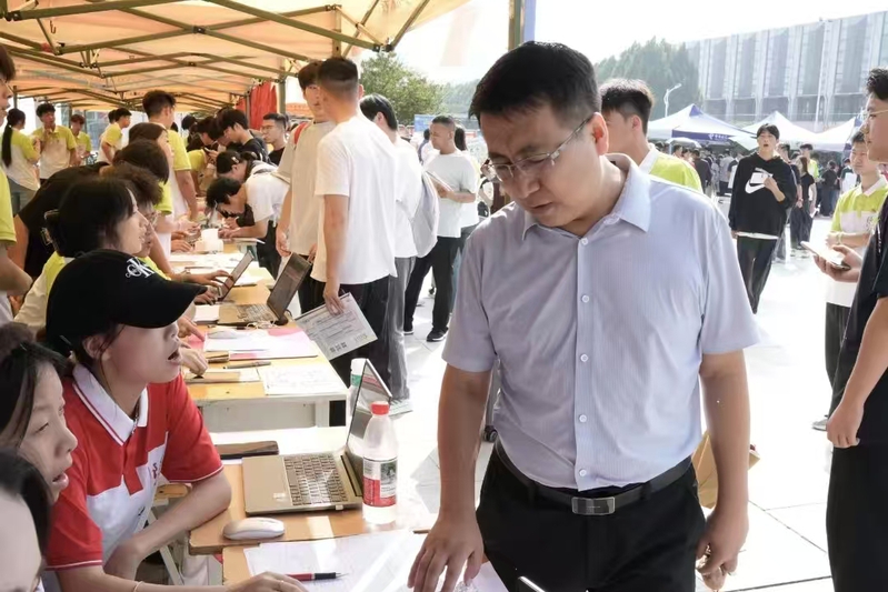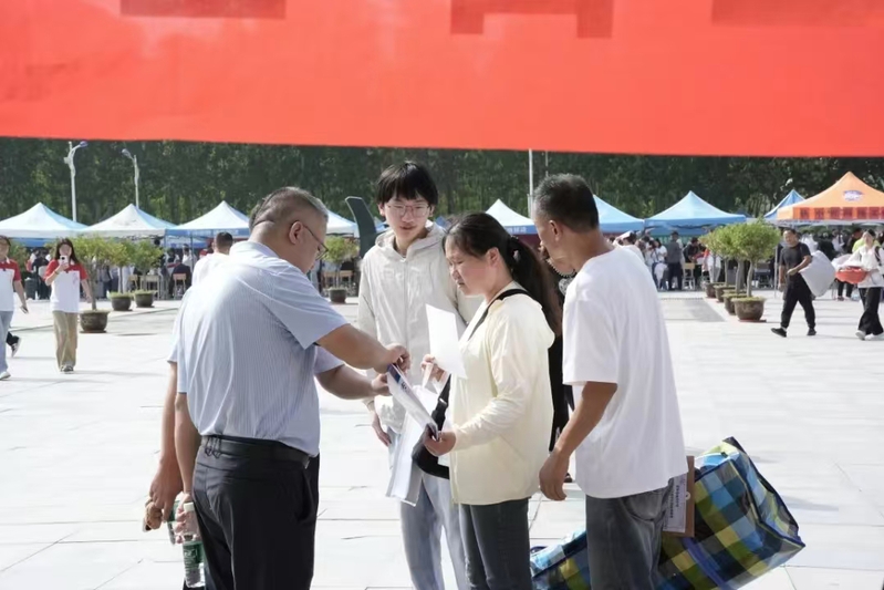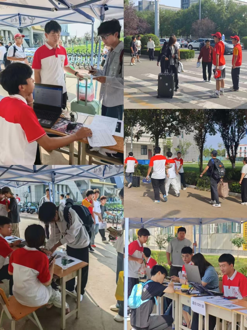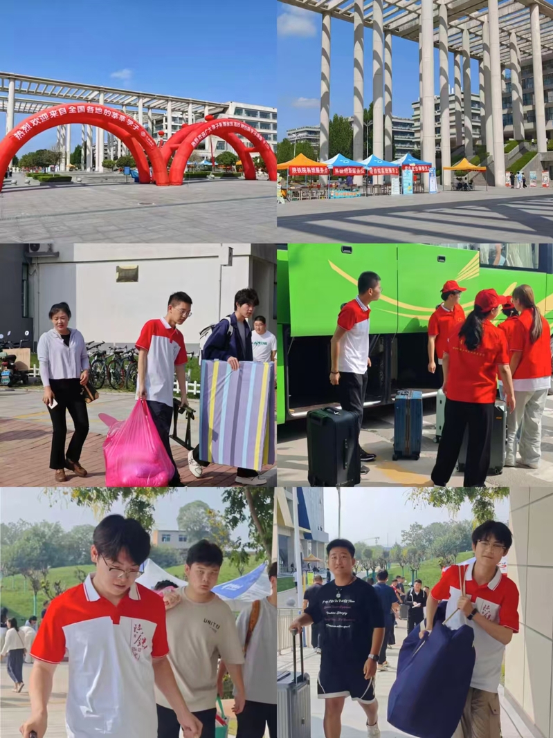 清晨七点,迎新帐篷整齐排列,红幅高悬,校、两级领导、辅导员班主任与班导生及百余名志愿者早已就位,扫描录取通知书、发放校园卡,各环节高效流畅;行李搬运穿梭往返,绿色通道为家庭困难学生快速办理学费缓交。