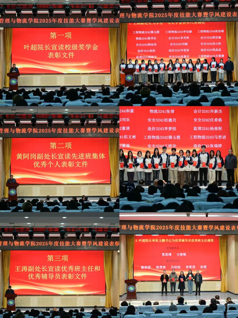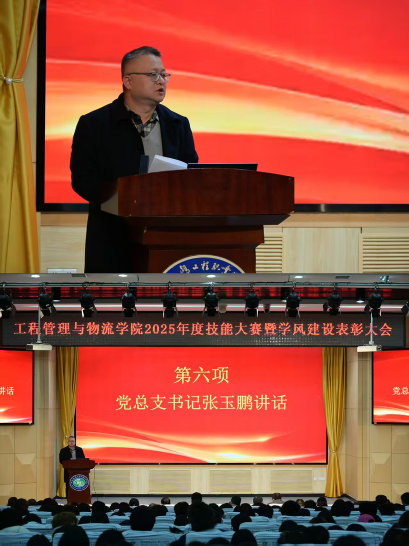 为表彰先进、树立榜样,激发学生学习热情,营造奋发向上的学风氛围,12月10日下午,工程管理与物流学院在高新校区博爱厅隆重召开2025年度技能大赛暨学风建设表彰大会。校长韩小卫、学院院长叶超、党总支书记张玉鹏、副院长杨小玉,学生处副处长黄阿岗、教务处副处长王涛,以及各科室负责人、全院师生共同参会。