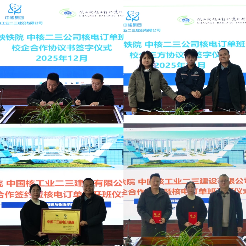 12月23日,陕西铁路工程职业技术学院与中国核工业二三建设有限公司校企合作签约暨核电订单班开班仪式在高新校区北三楼会议室举行。学校副校长祝和意、校企合作处处长姜留涛、工程管理与物流学院院长叶超、党总支书记张玉鹏、副院长杨小玉,以及中核二三公司连云港项目部管道队党支部副书记张艳、人力资源部主管冯哲,山东华成核建工程服务有限公司副经理姜宁等出席仪式。仪式由工程管理与物流学院副院长杨小玉主持。