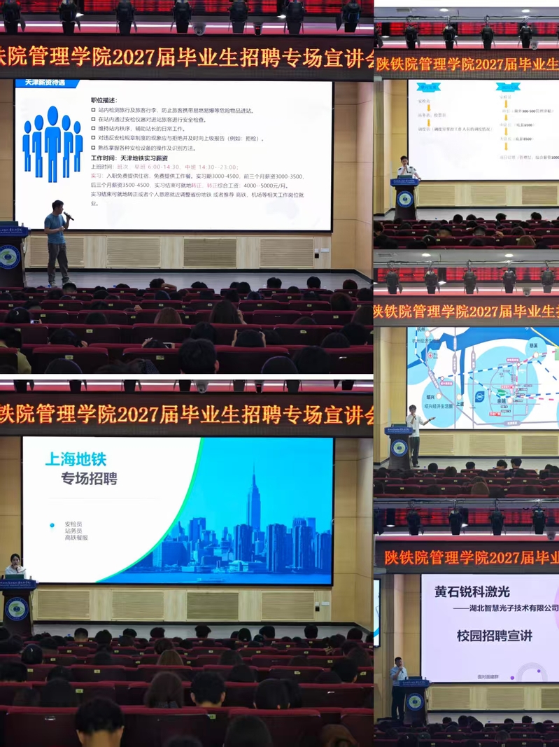 会上,上海羿铁轨道交通有限公司、陕西动铁轨道运营有限公司、北京恒安卫士安检集团有限公司、武汉锐科光纤激光技术股份有限公司、舜宇集团有限公司五家企业依次开展宣讲。各企业宣讲人分别结合企业发展现状、核心业务、招聘岗位、薪酬福利及人才发展规划等内容,向同学们进行全面细致的讲解,让毕业生清晰了解行业动态与岗位需求。